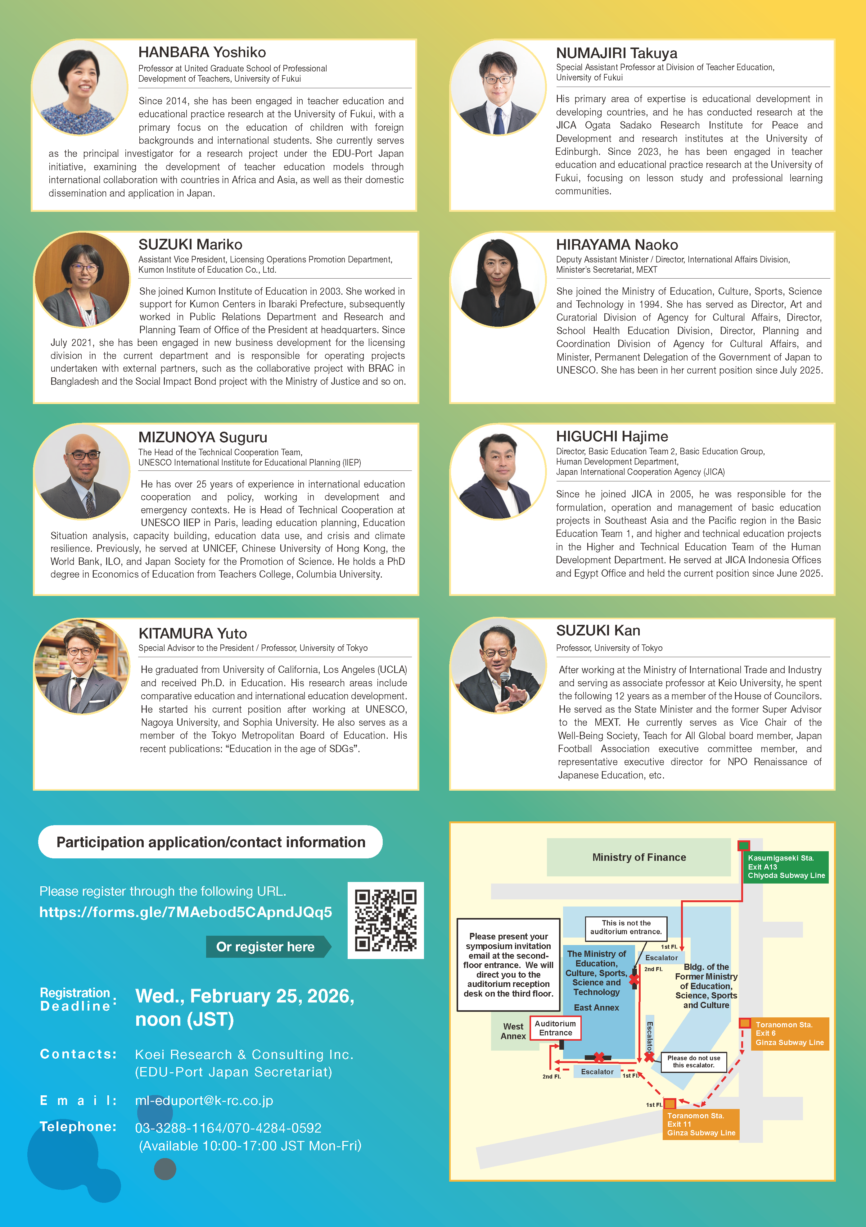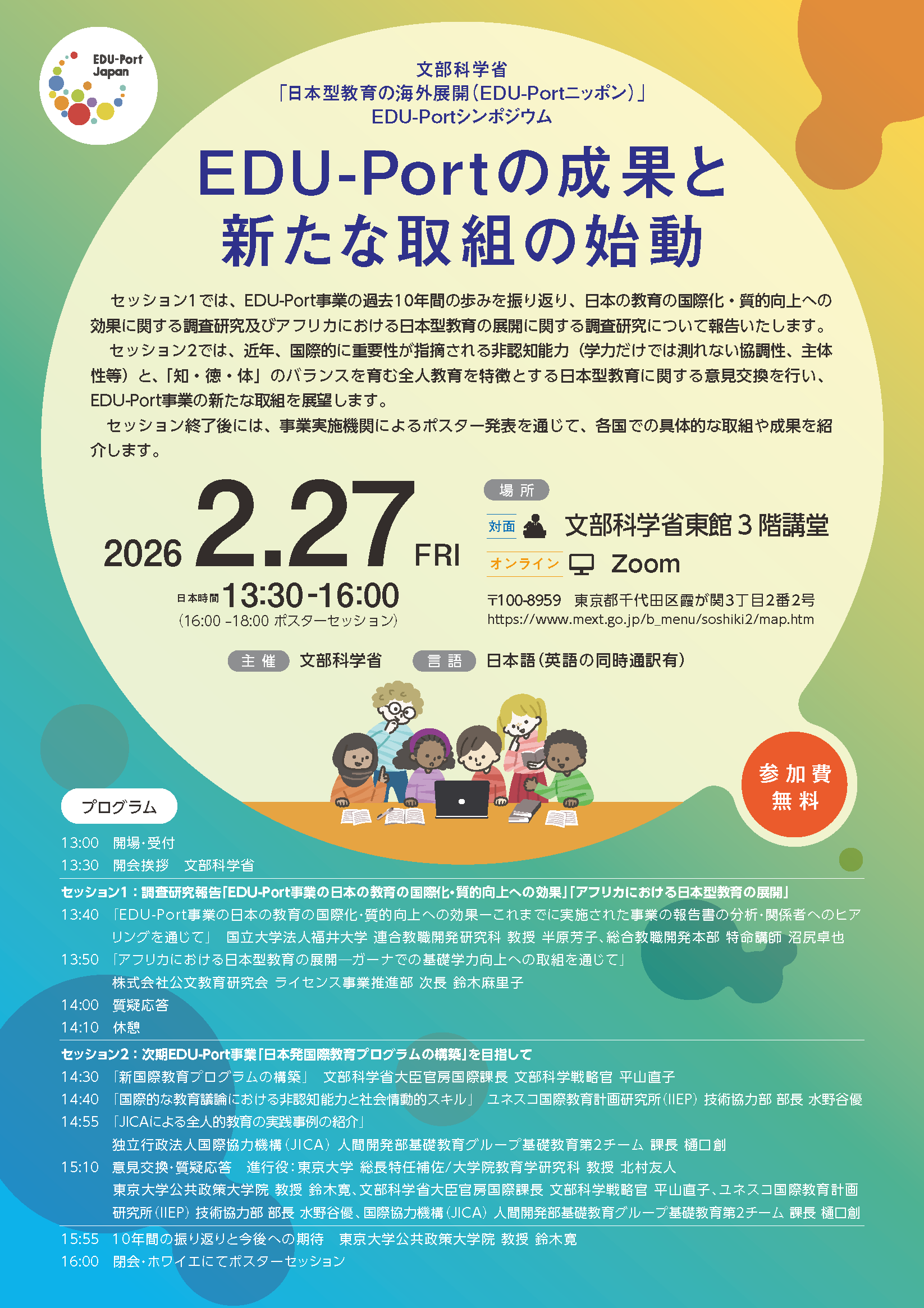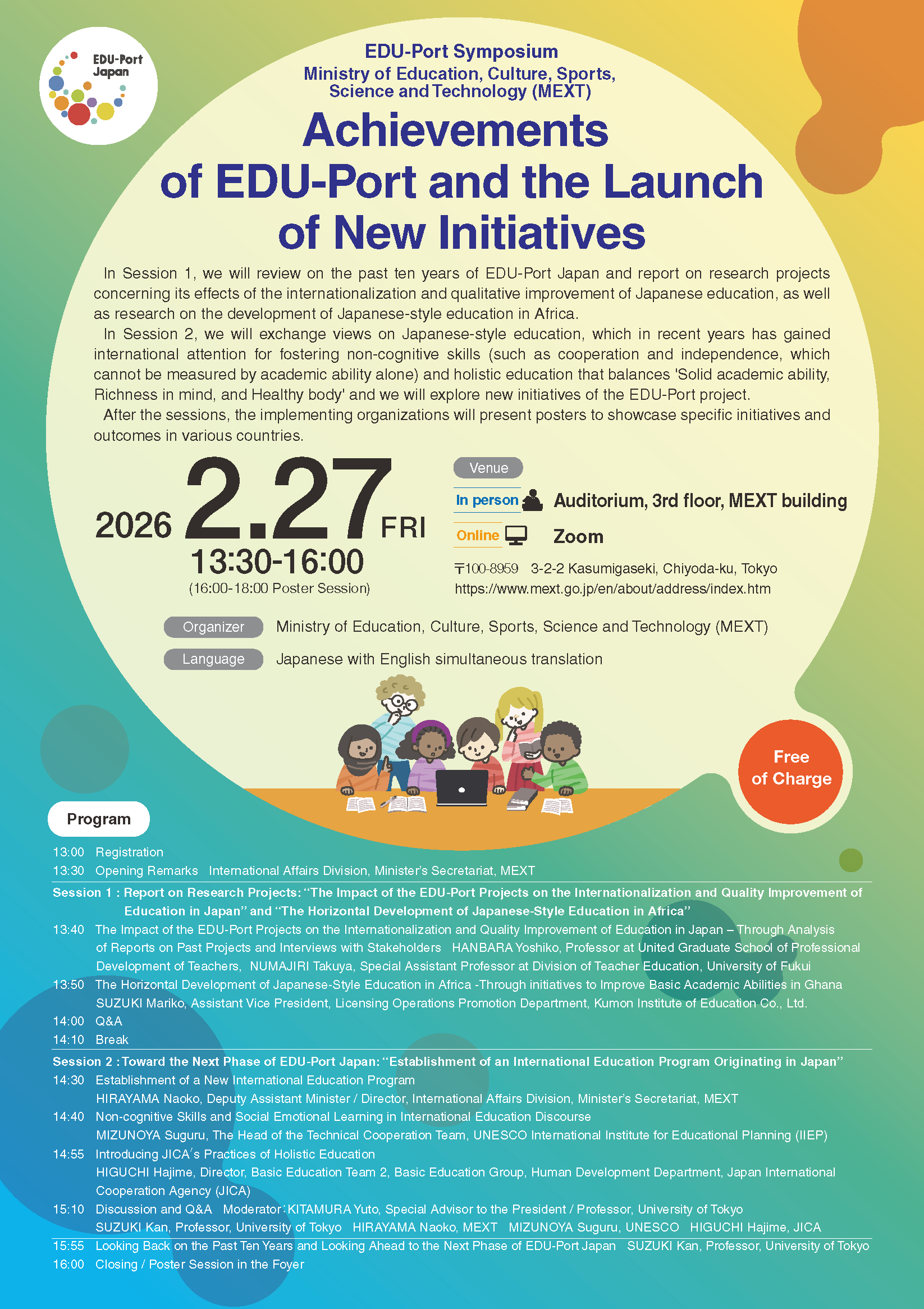 平成28年4月に開始した文部科学省「日本型教育の海外展開(EDU-Portニッポン)」は令和8年3月で丸10年を迎えます。この度EDU-Portは、「EDU-Portの成果と新たな取組の始動」と題し、令和7年度シンポジウムを開催いたします。